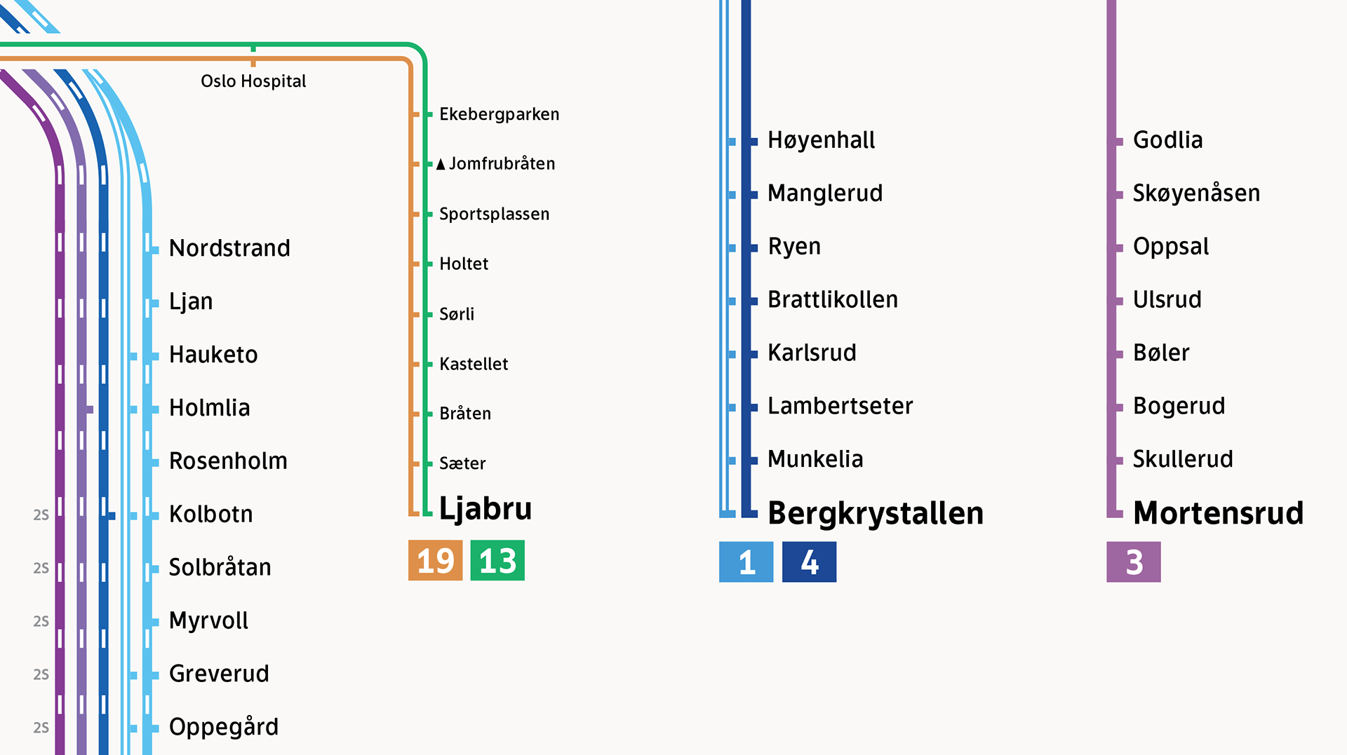 In 2017, I made an unofficial transit diagram covering the Oslo region in Norway. The challenge consisted of combining the metro, tram and train network in one single diagram. Five years later, I revisited the project with several improvements: