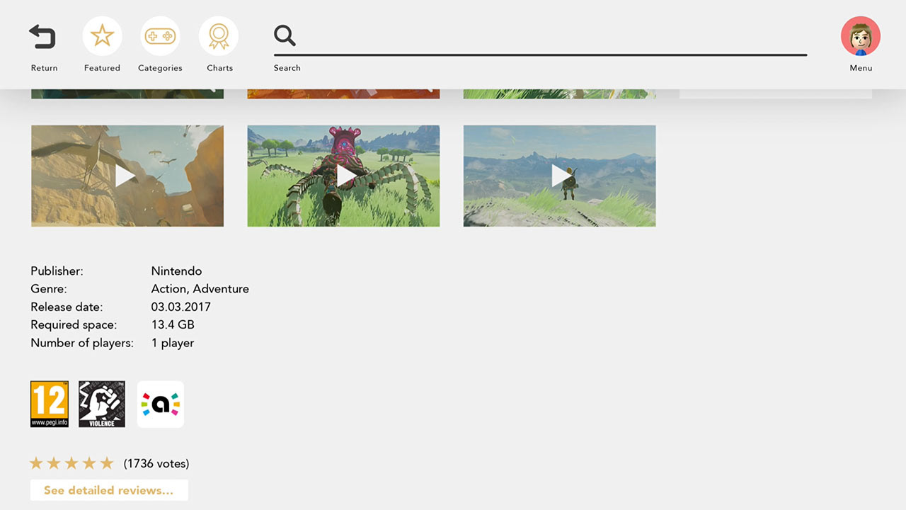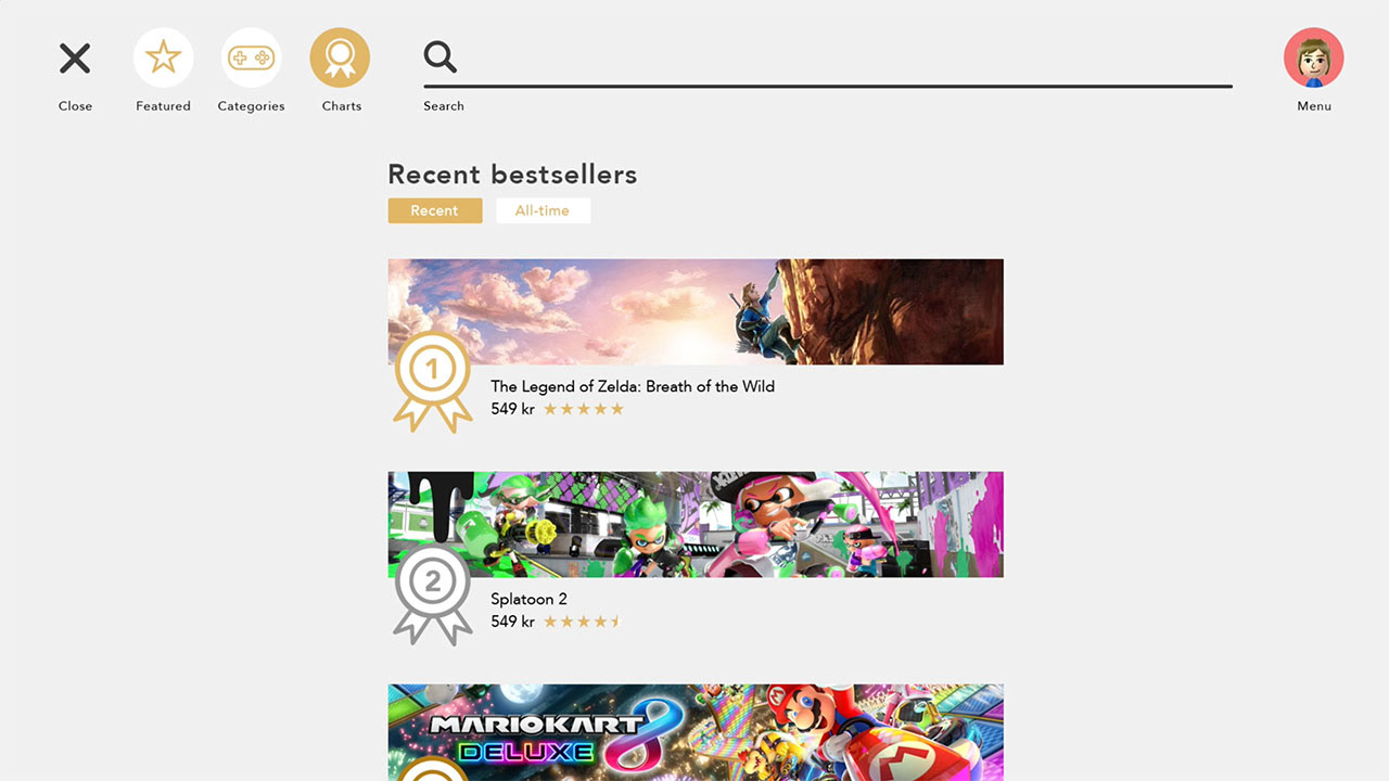 Above you'll see the official eShop menu on the Wii U console and the official Nintendo Switch home menu. I aimed to keep the visual style of the Nintendo Switches home menu UI, as well as keep the most important elements from the Wii U eShop menu and strip the ones that aren't necessary.